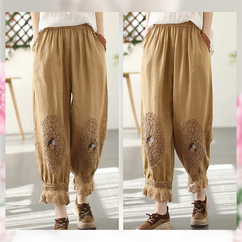 Ez a vászon- és pamut hímzéssel ellátott női csipkenadrág minden alakhoz passzol, és elasztikus dereka nem korlátozza viselését. Van egy nagyon befogadó változata és egy laza szabású változata, amely jobban elrejti a lábzsírt.