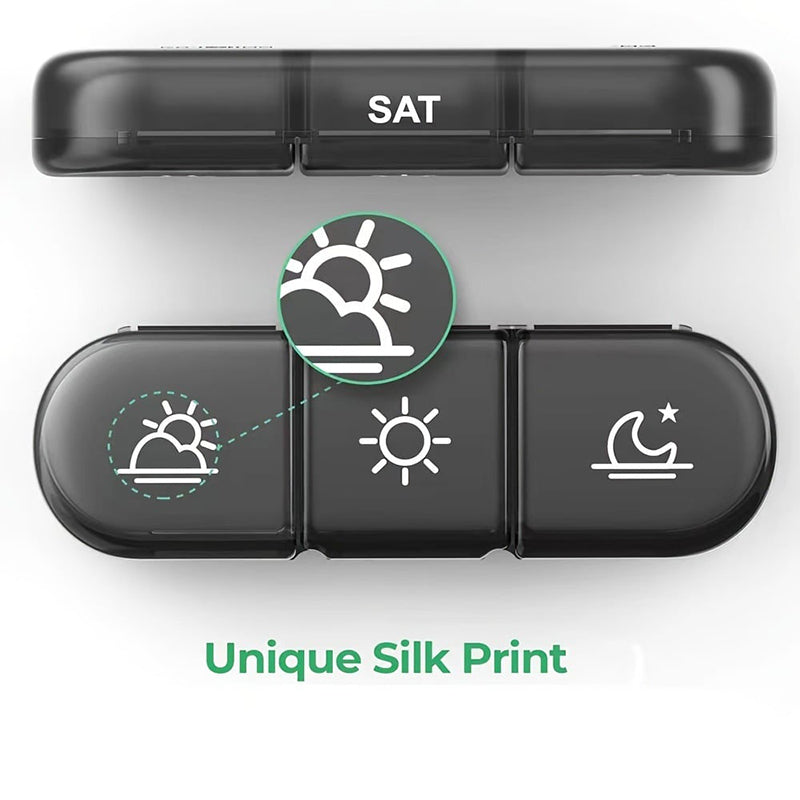 NAGY KAPACITÁSÚ, 7 NAPOS SZERVEZŐ - Tervezze meg gyógyszeres kezelését egy egész hétre. Minden napi tartály három tágas rekesszel rendelkezik a reggeli, déli és esti adagok számára, így biztosan nem marad le a gyógyszeres kezelésről, ha úton van.