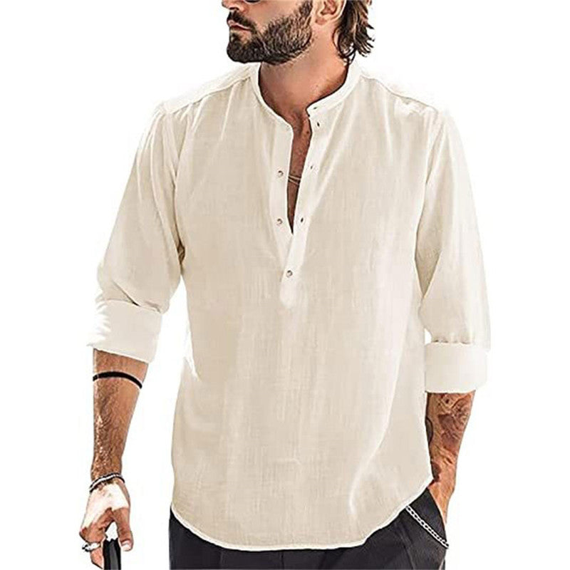 【Jellemzők】 Alkalmi férfi vászoning állógallérral, egyszínű, vékony szabású, hosszú ujjú (felhajtott) és gombos záródású.