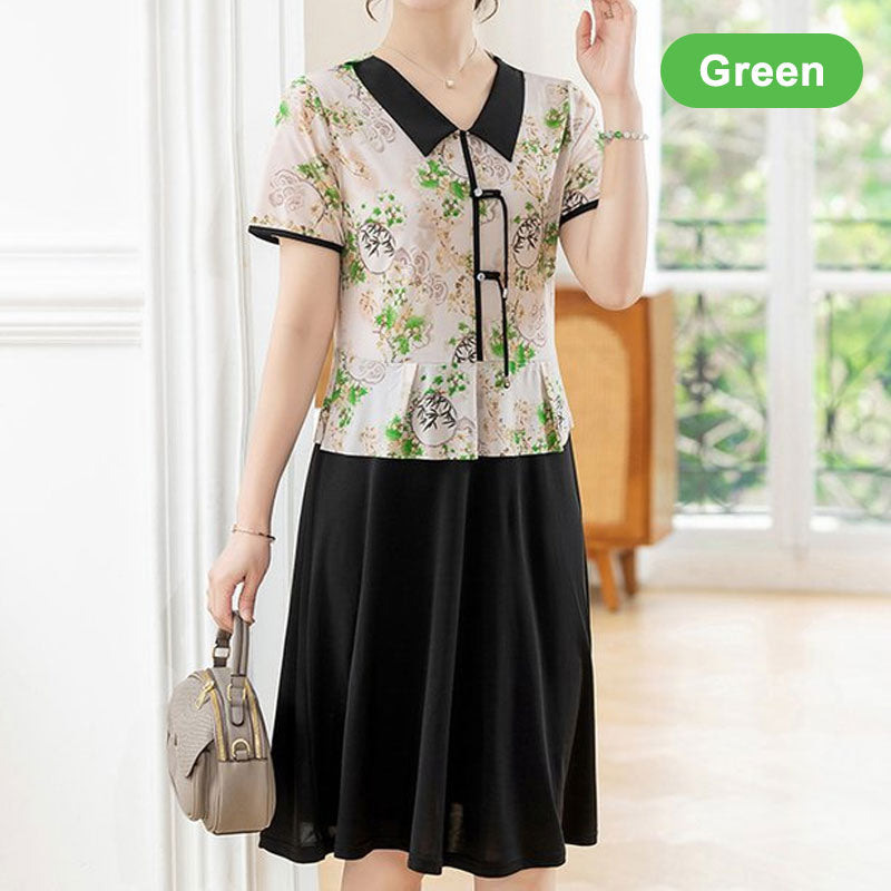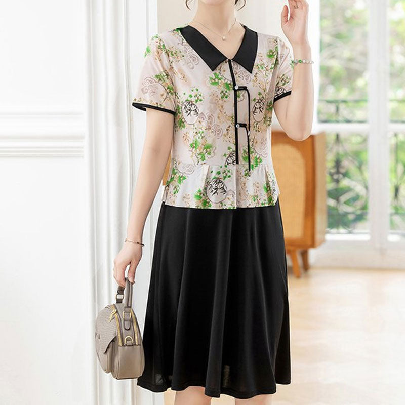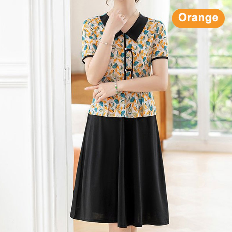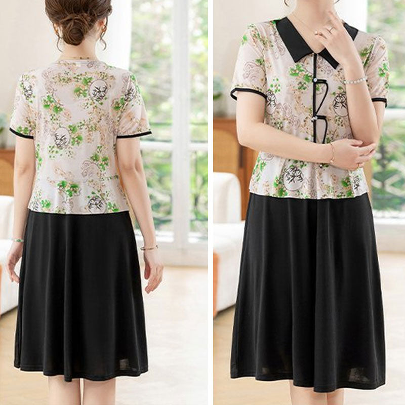 Stílusos, kétrészes megjelenés: A ruha virágmintás paneljei zökkenőmentesen keverednek a tömör fekete alappal, hogy az elegáns, kétrészes megjelenés illúzióját keltsék.